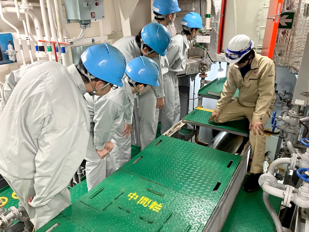 また、機関監視室にて機関長から機関部の業務について説明を行い、機関日誌や燃料計測などの解説を行いました。